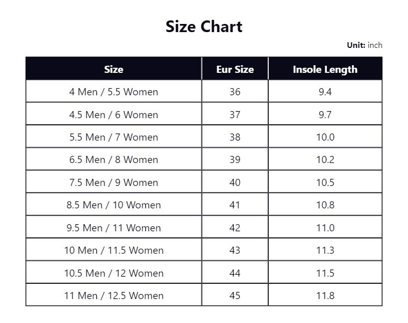 4 Men / 5.5 Women, 5.5 Men / 7 Women, 8.5 Men / 10 Women, 10 Men / 11.5 Women, 11 Men / 12.5 Women, 4.5 Men / 6 Women, 6.5 Men / 8 Women, 7.5 Men / 9 Women, 9.5 Men / 11 Women, 10.5 Men / 12 Women