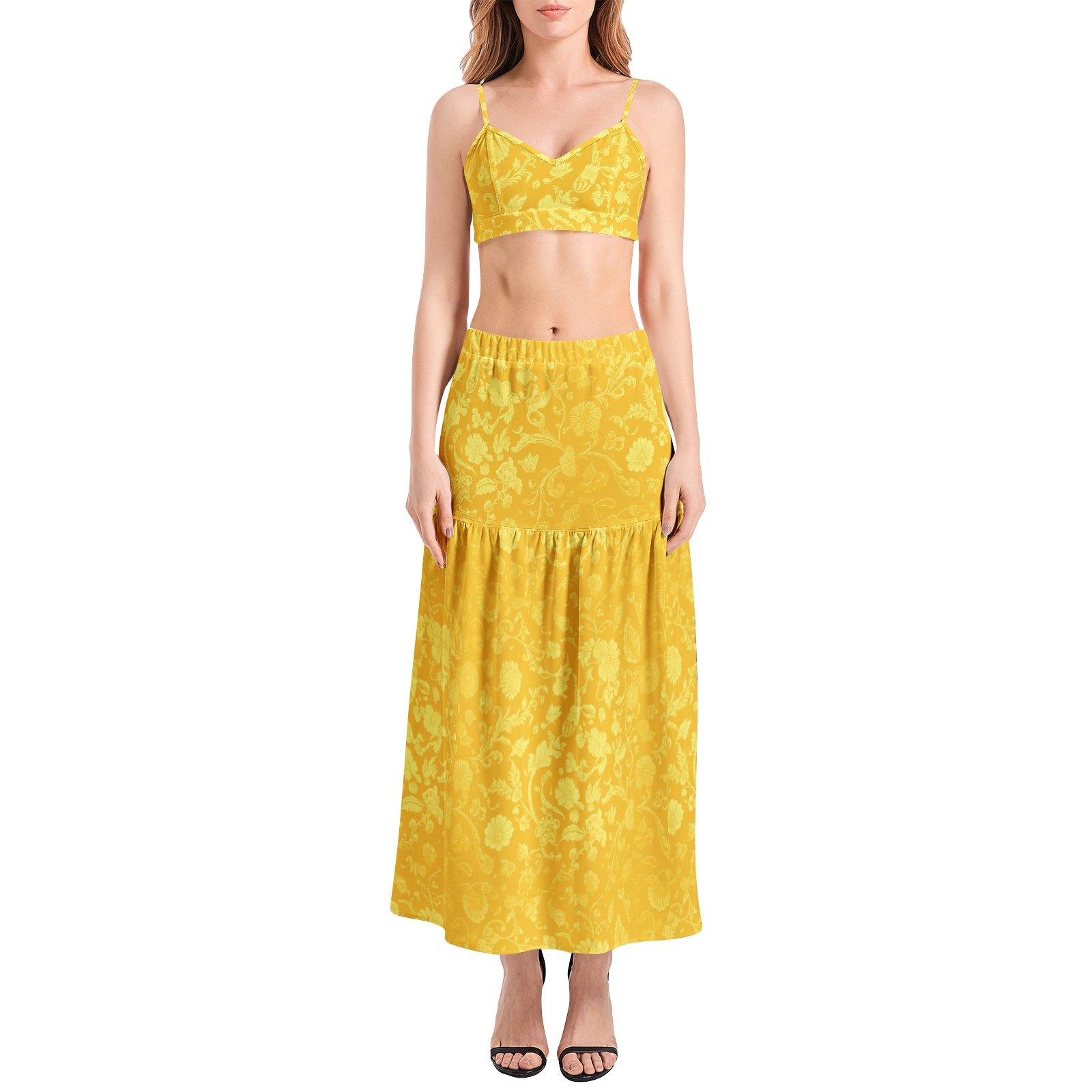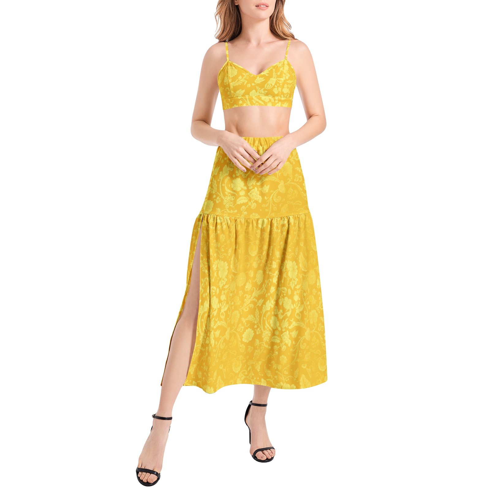 Adjustable spaghetti strap, Ruched crop cami top, Long length skirt, Slit thigh, Soft two pieces suit for Women
