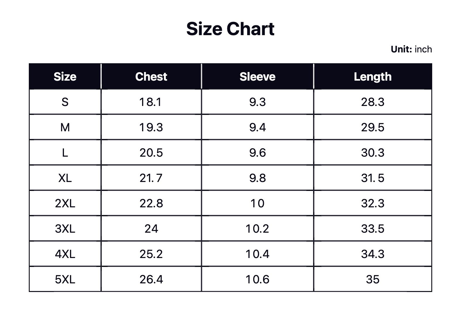 S, M, L, XL, 2XL, 3XL, 4XL, 5XL