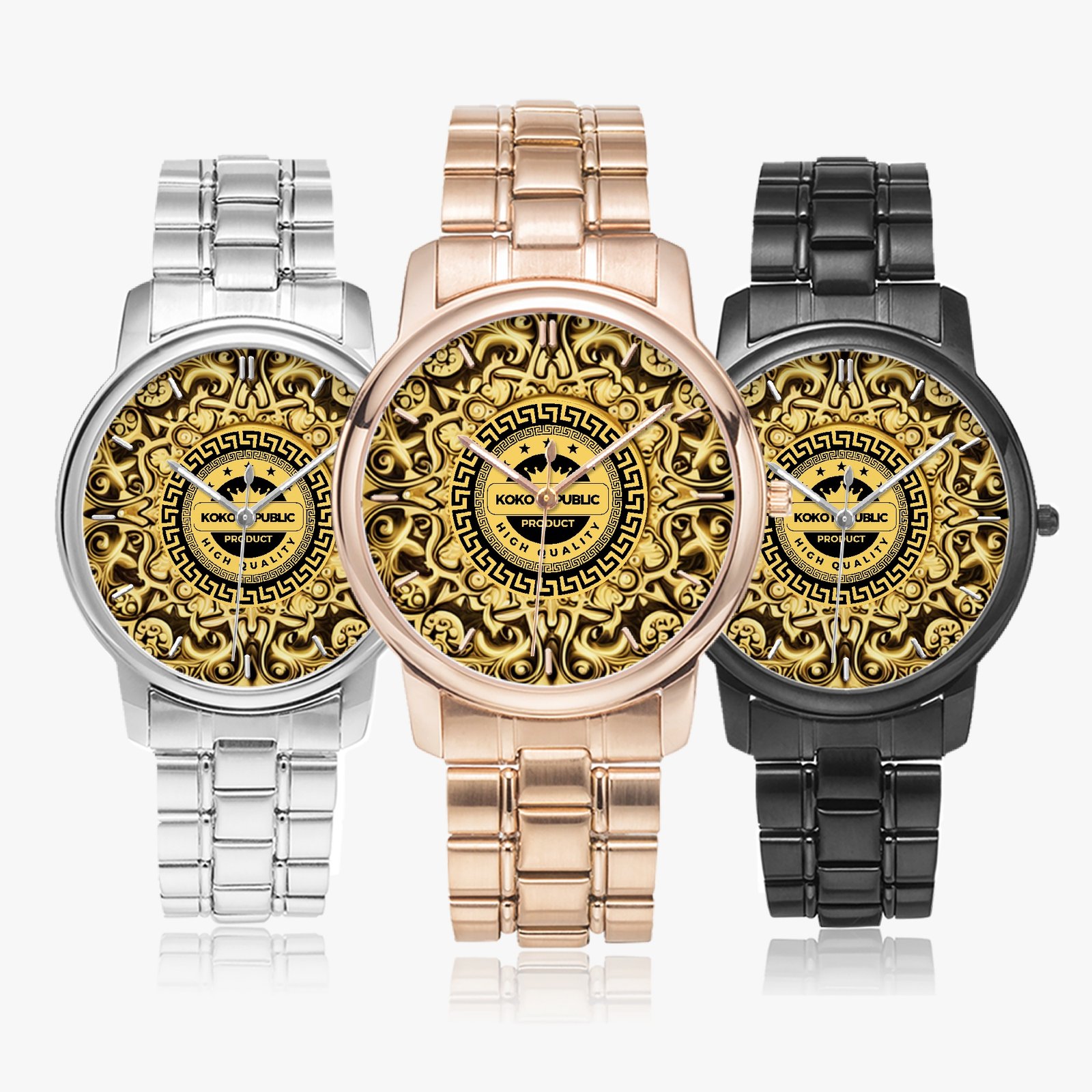 High density 304 stainless steel case and bands, electroplated process to get great glossiness and various colors. No allergy.