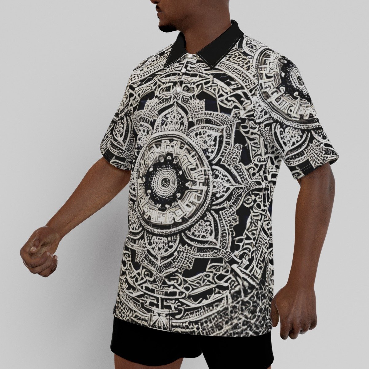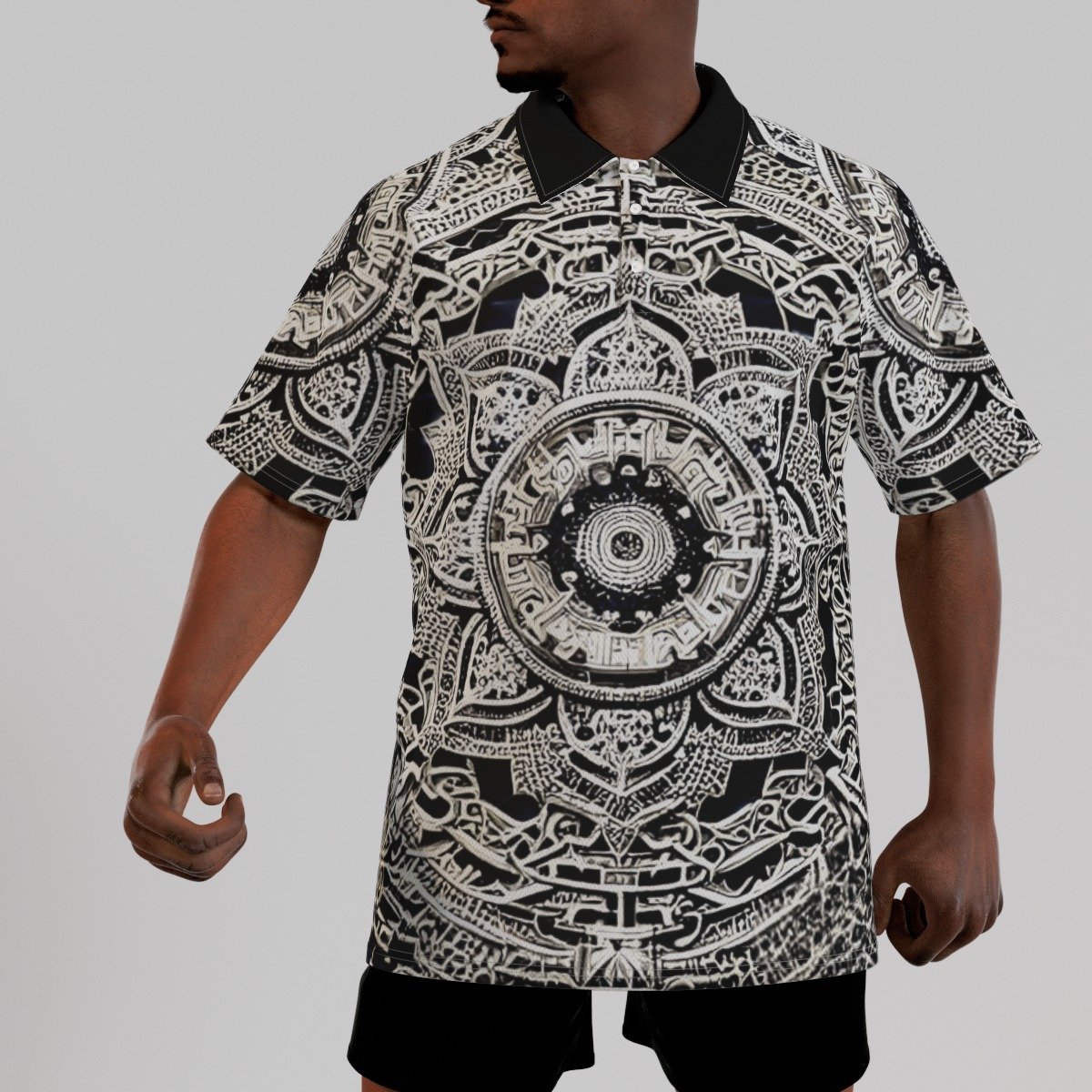 - Short sleeve, raglan sleeve, stand-up collar, button closure