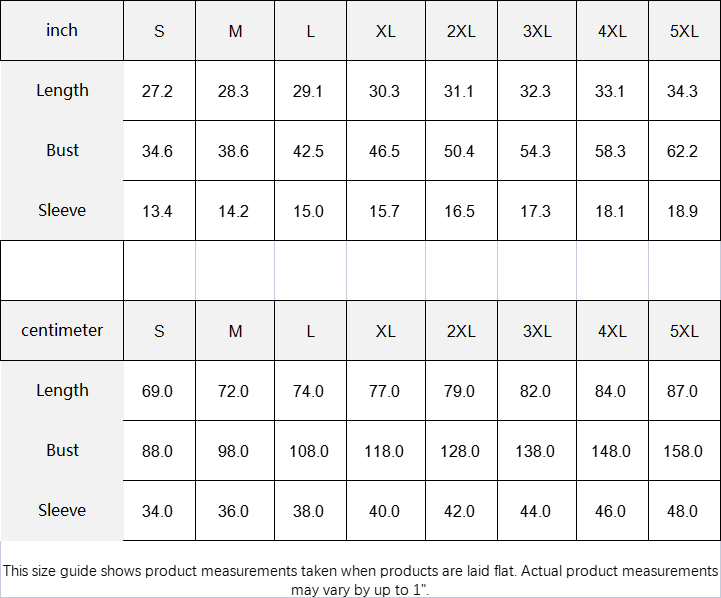 | inch | S | M | L | XL | 2XL | 3XL | 4XL | 5XL |