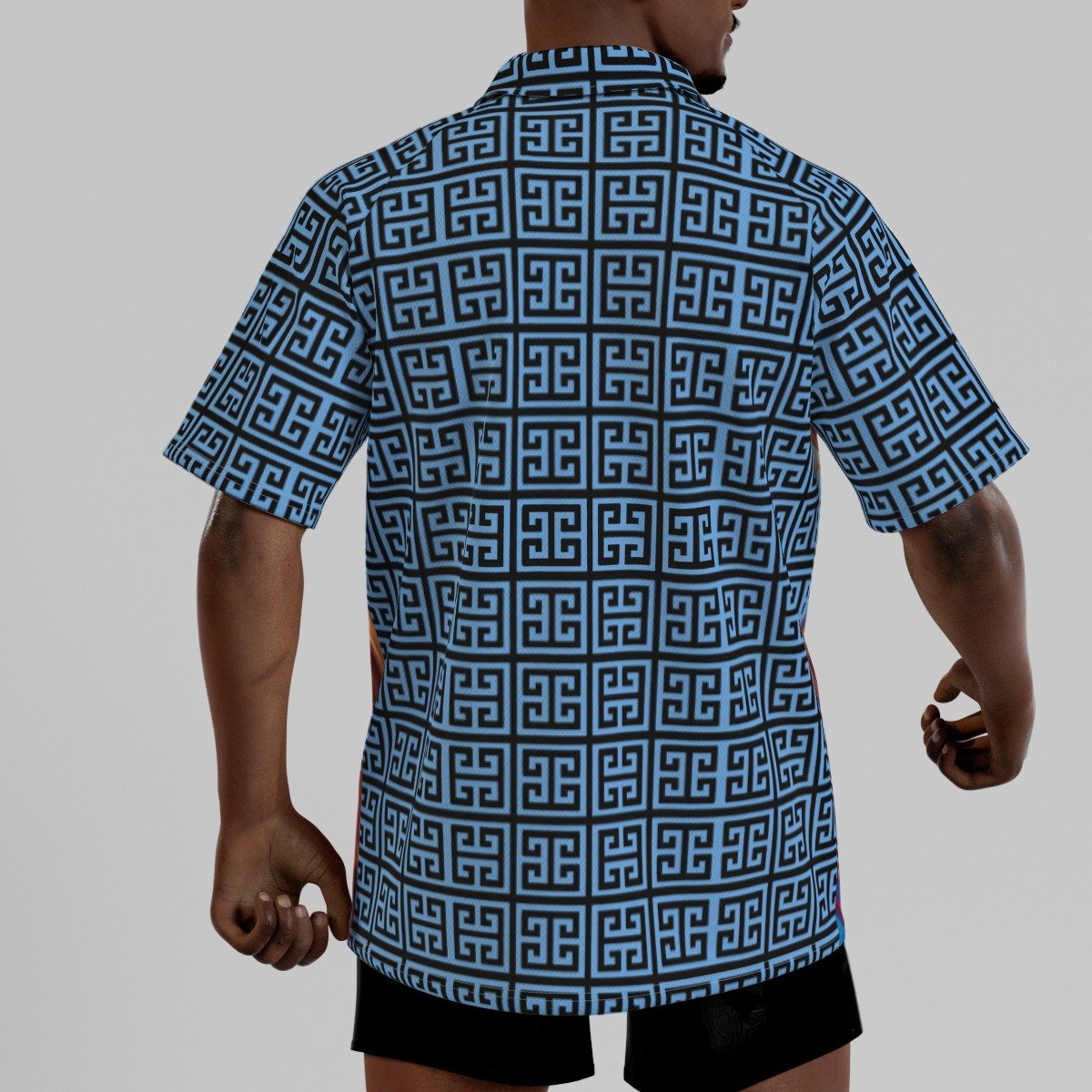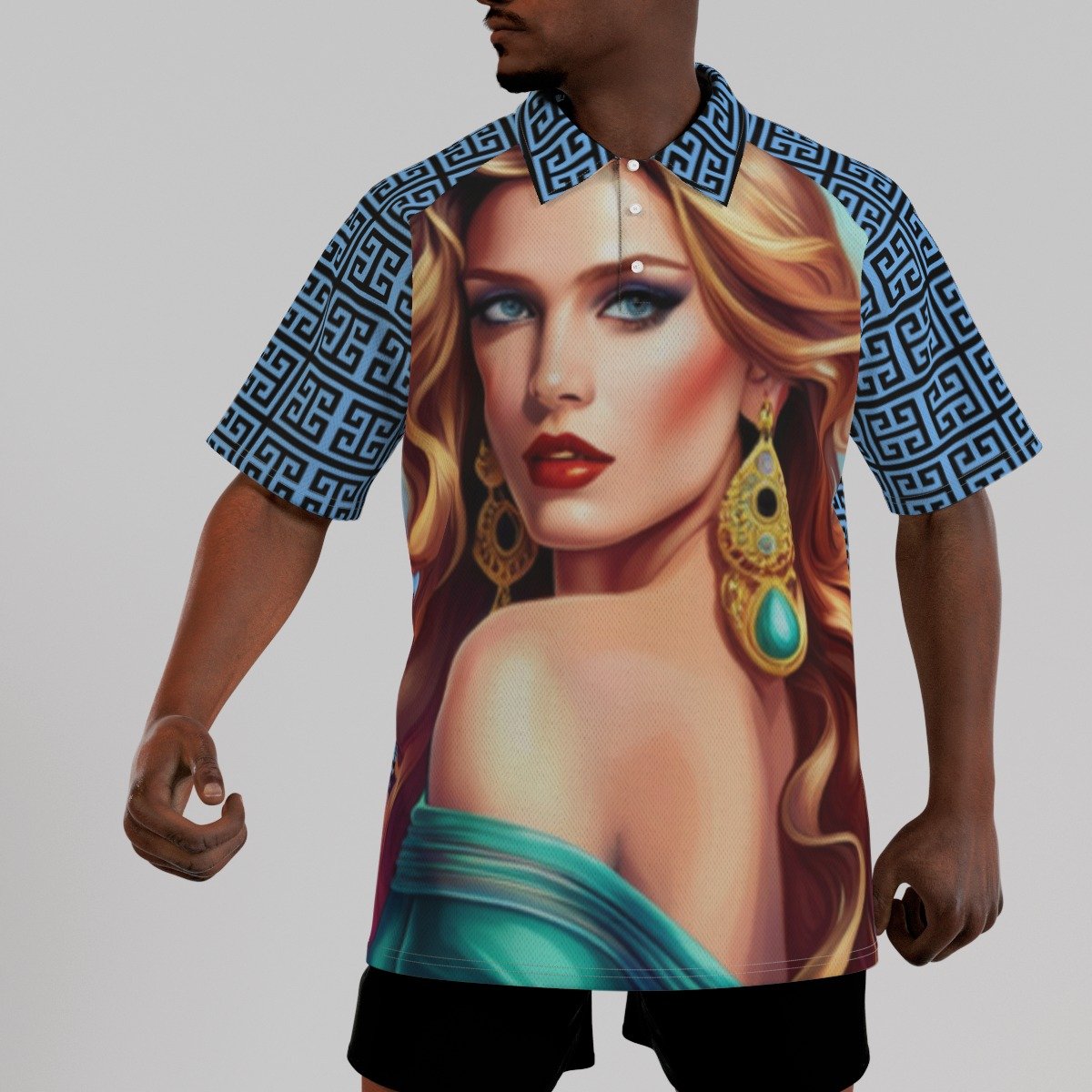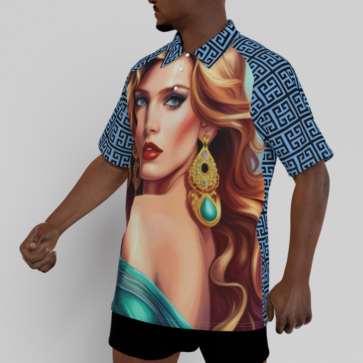 - Short sleeve, raglan sleeve, stand-up collar, button closure