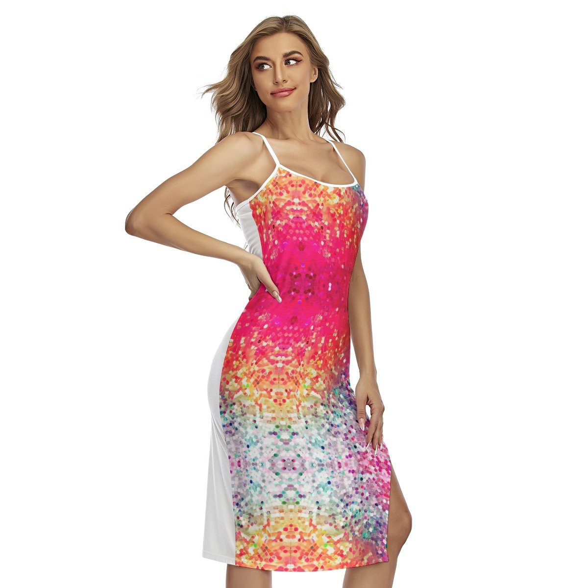 - Spaghetti straps, cross back tie, side split
