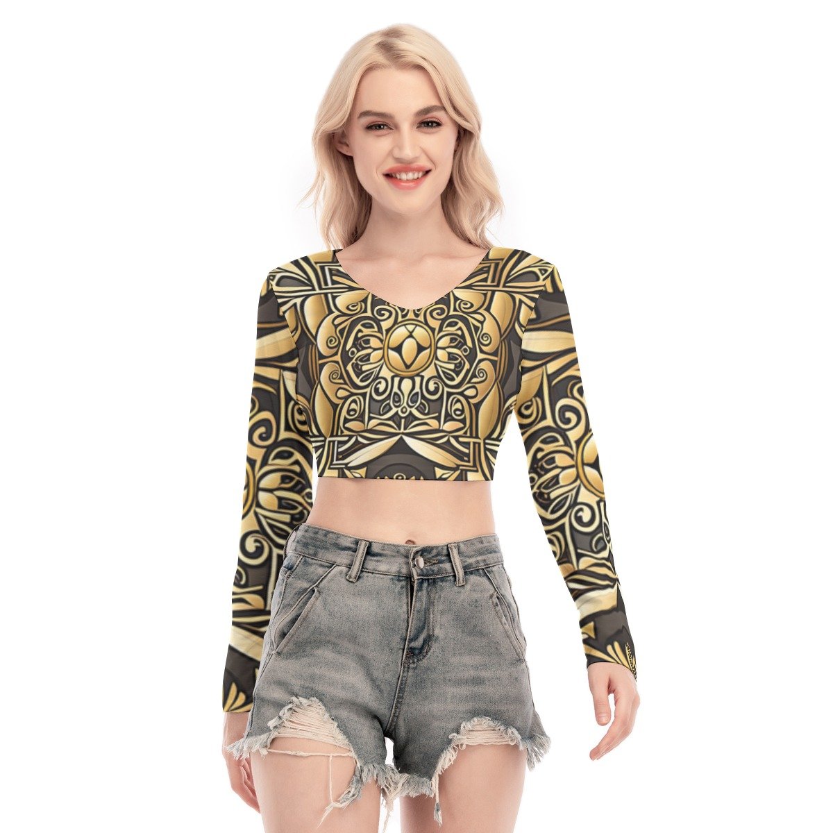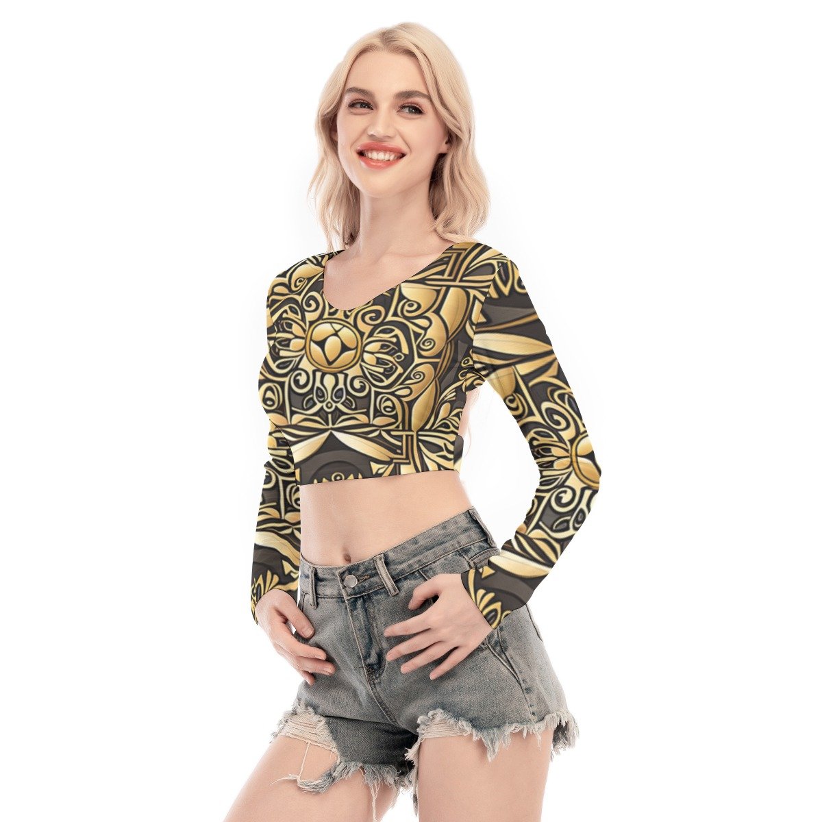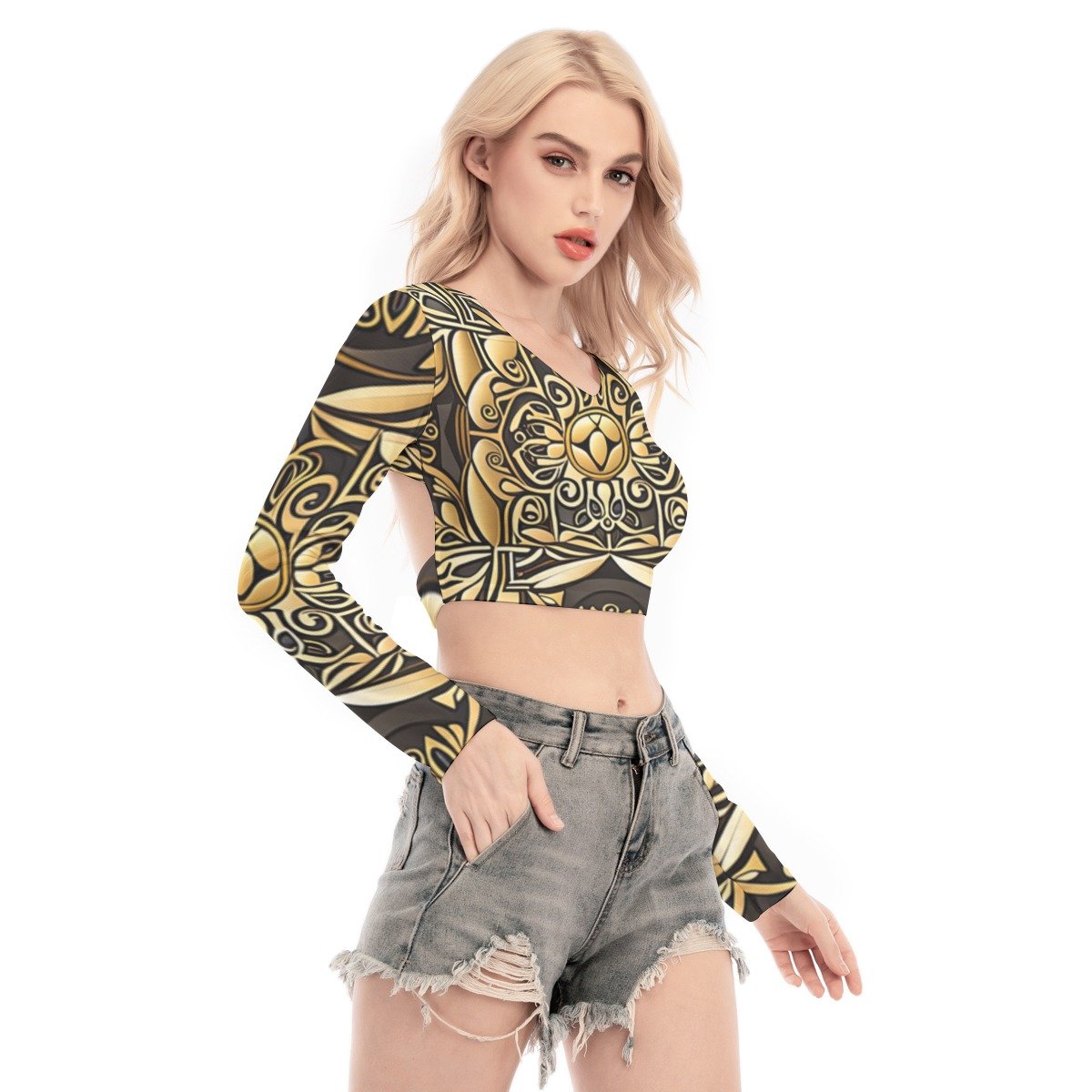 - Back hollow, crew neck, long sleeve, tie waist