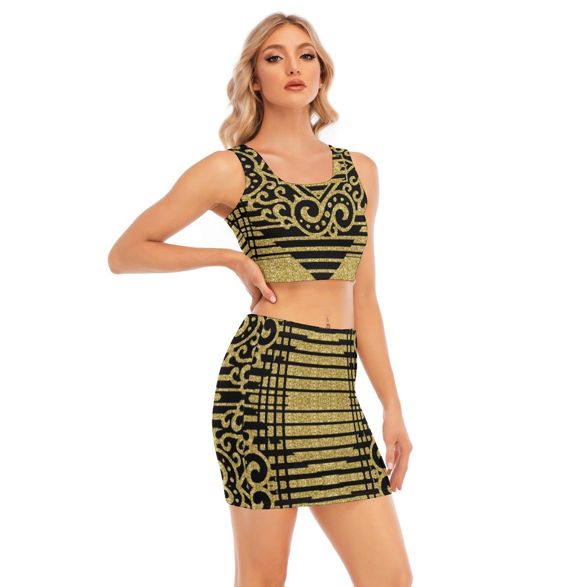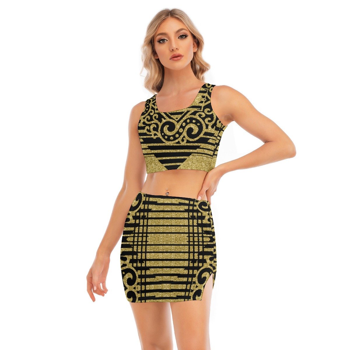 Two piece, elastic cami crop top and wrap skirt, suitable for summer beach wear and going out.