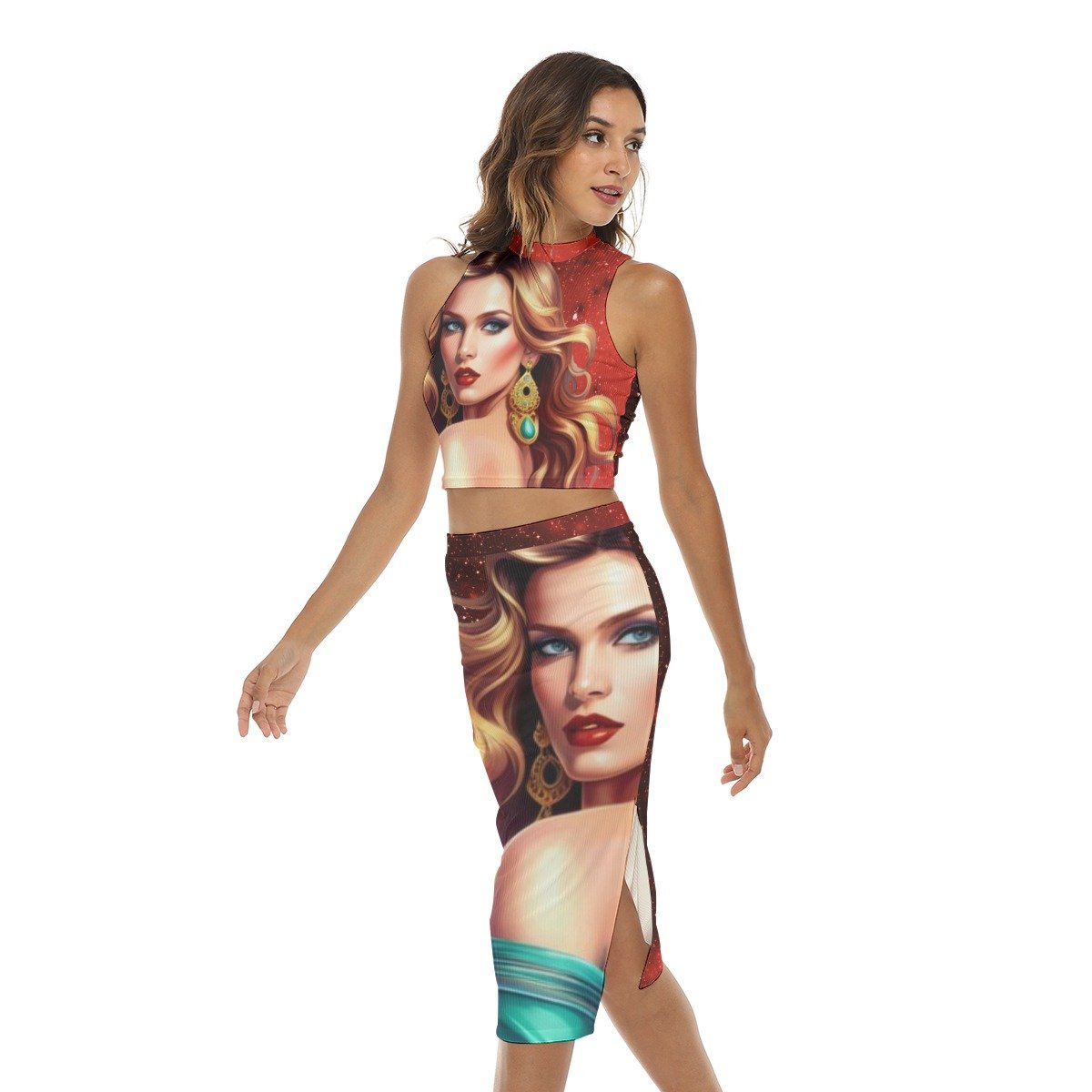 Stand-up collar cropped top, matched with a split hip skirt, can show a sexy figure very well