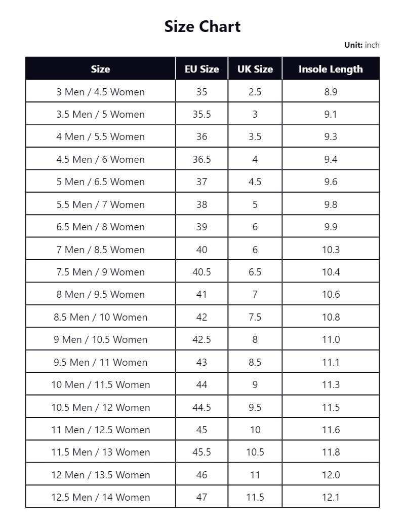 3 Men / 4.5 Women, 3.5 Men / 5 Women, 4 Men / 5.5 Women, 4.5 Men / 6 Women, 5 Men / 6.5 Women, 5.5 Men / 7 Women, 6.5 Men / 8 Women, 7 Men / 8.5 Women, 7.5 Men / 9 Women, 8 Men / 9.5 Women, 8.5 Men / 10 Women, 9 Men / 10.5 Women, 9.5 Men / 11 Women, 10 Men / 11.5 Women, 10.5 Men / 12 Women, 11 Men / 12.5 Women, 11.5 Men / 13 Women, 12 Men / 13.5 Women, 12.5 Men / 14 Women