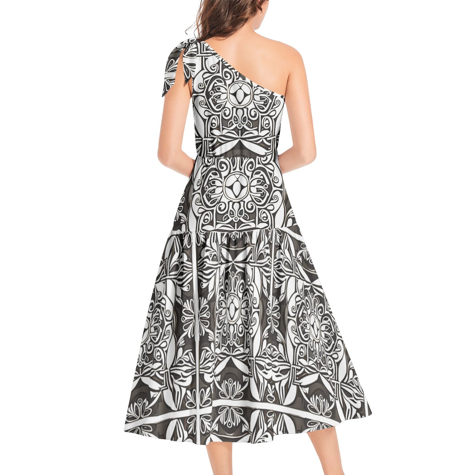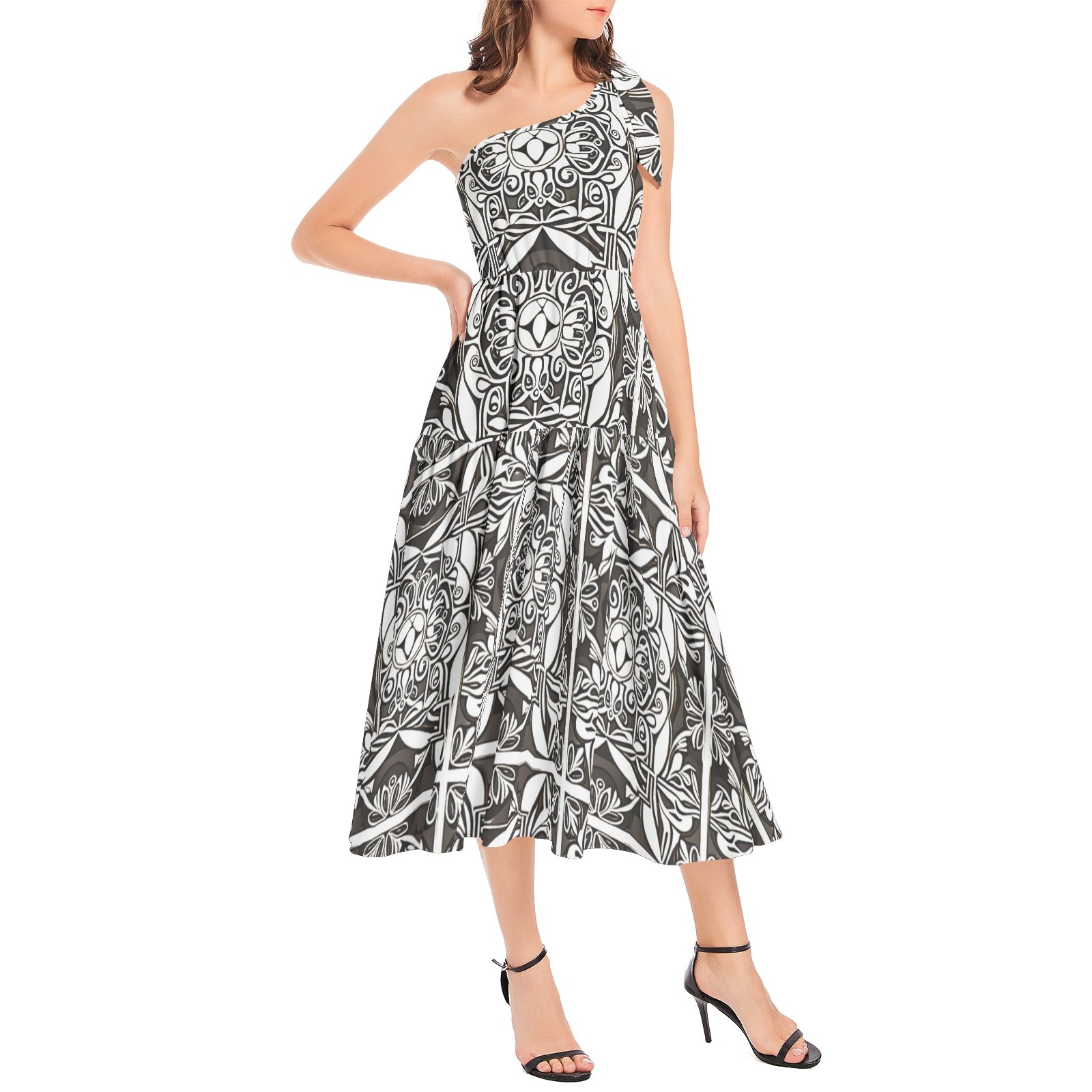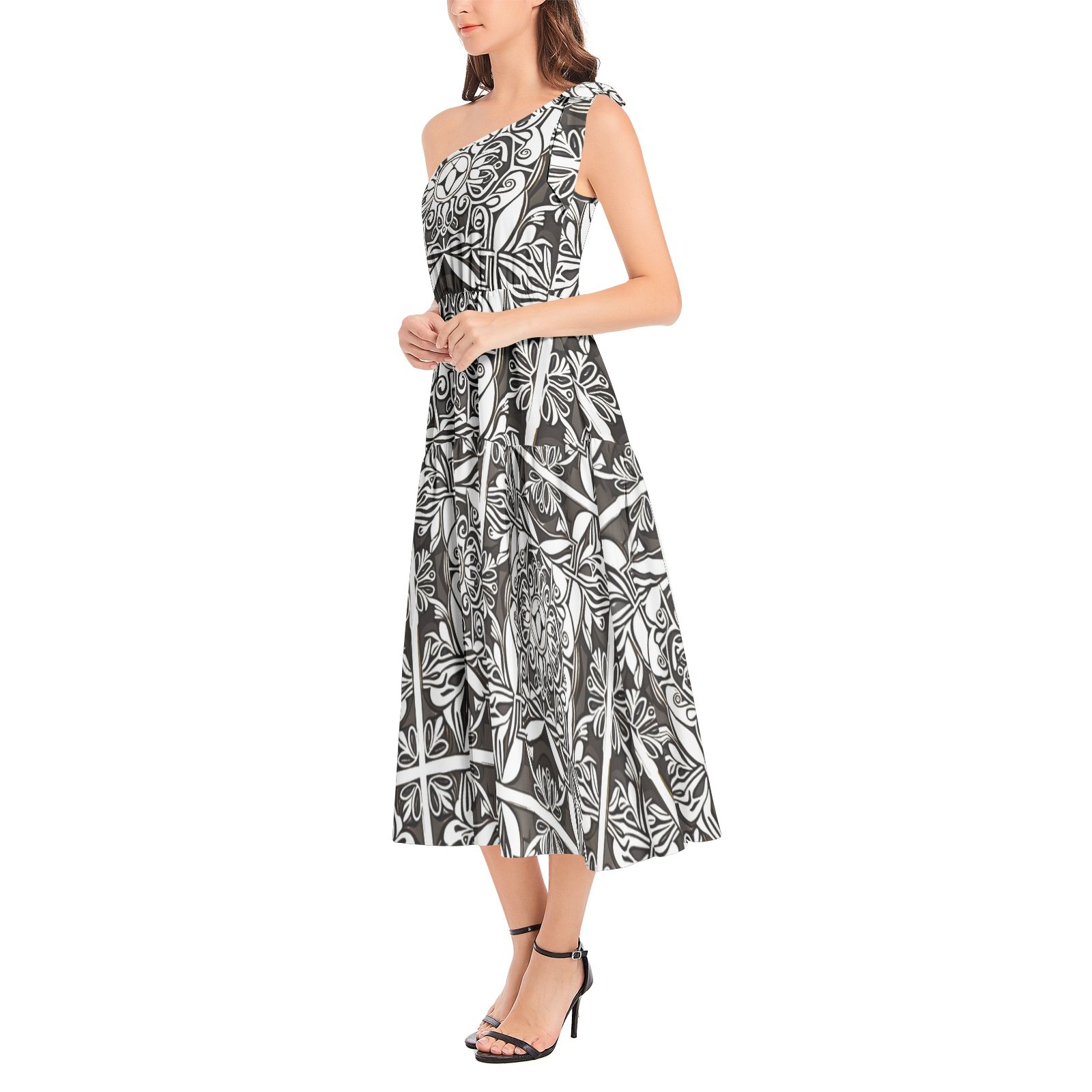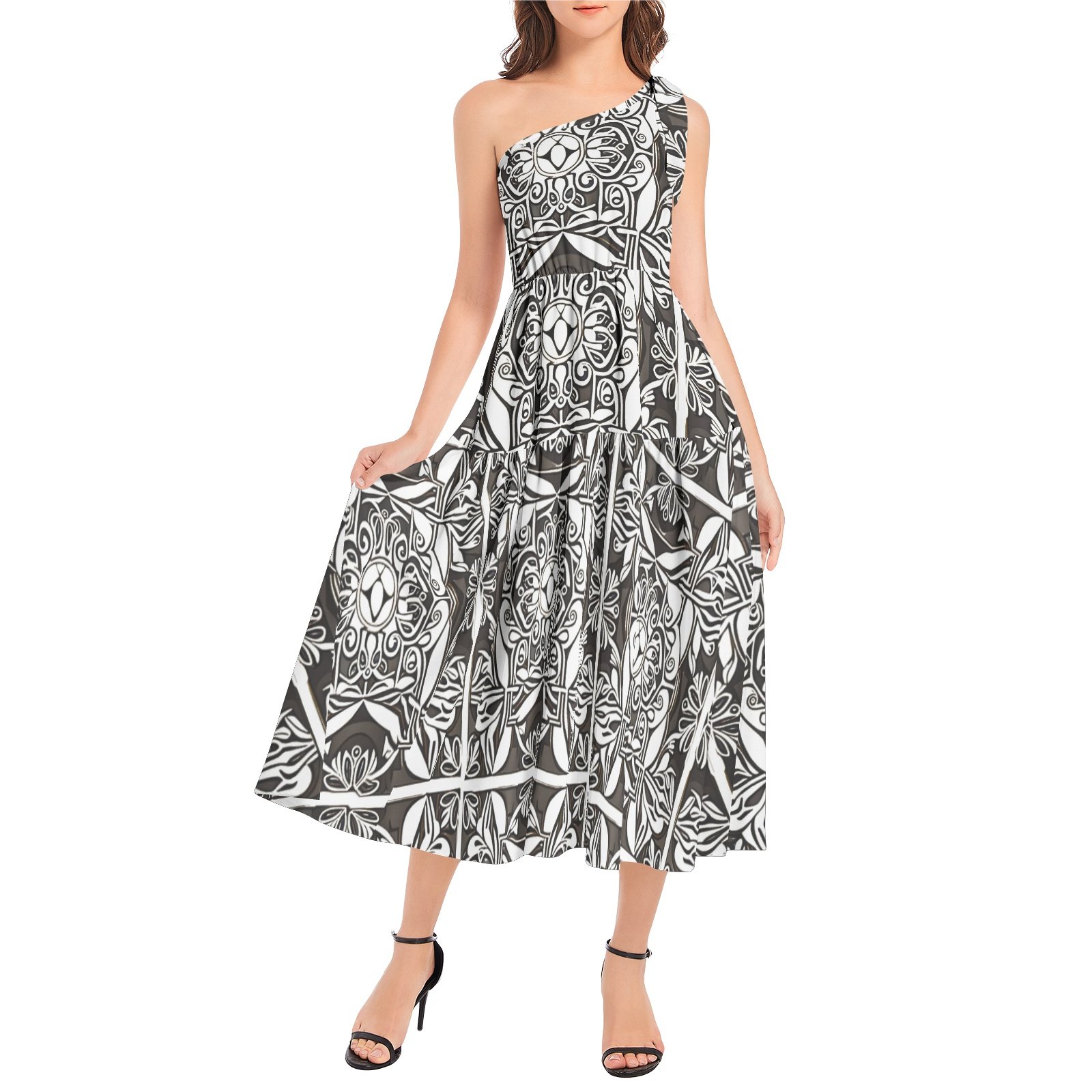 One shoulder, Flared hem, High waist, Pull on closure, Two inseam pockets, Casual women’s A-Line midi dress