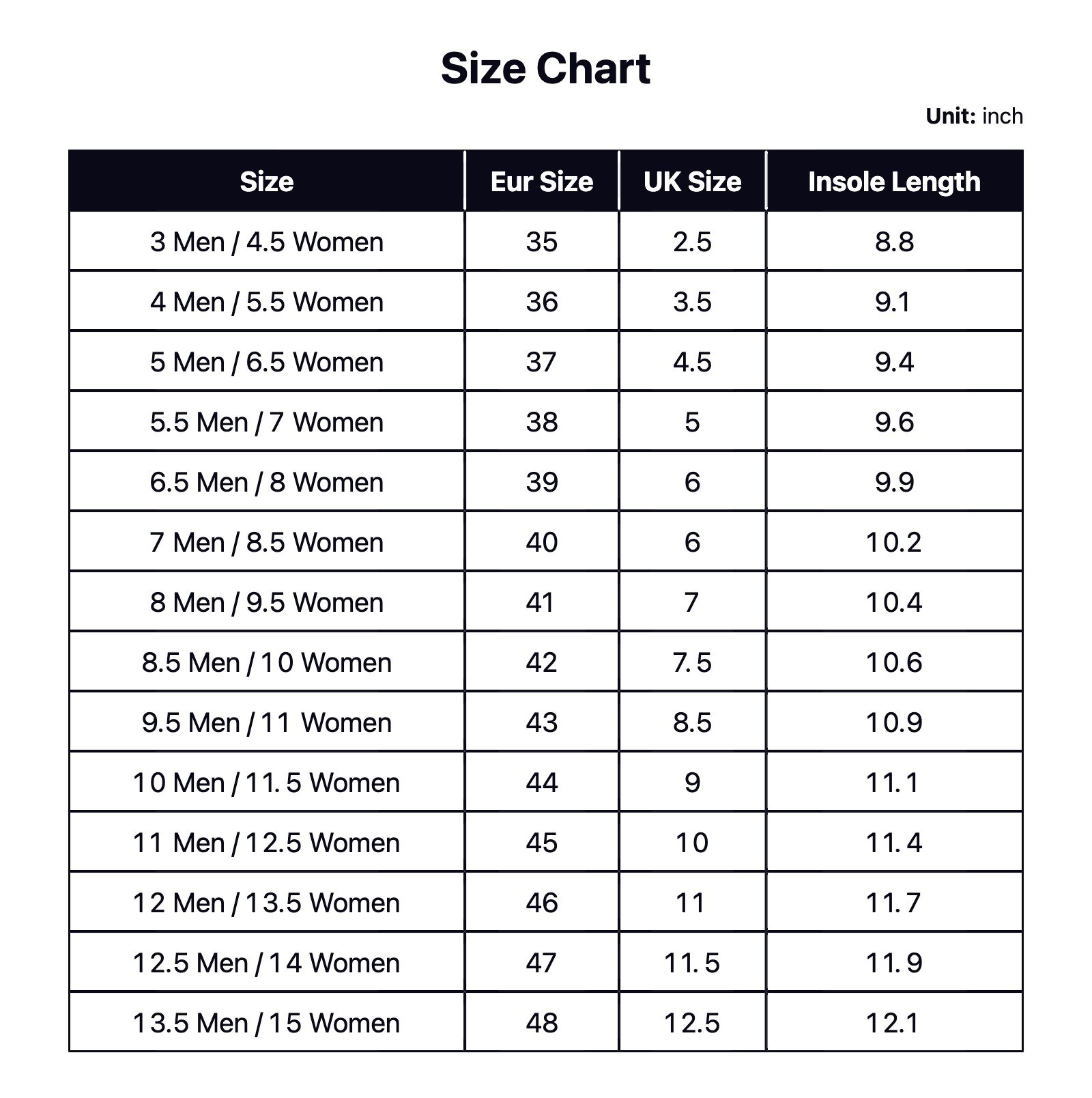 3 Men / 4.5 Women, 4 Men / 5.5 Women, 5 Men / 6.5 Women, 5.5 Men / 7 Women, 6.5 Men / 8 Women, 7 Men / 8.5 Women, 8 Men / 9.5 Women, 8.5 Men / 10 Women, 9.5 Men / 11 Women, 10 Men / 11.5 Women, 11 Men / 12.5 Women, 12 Men / 13.5 Women, 12.5 Men / 14 Women, 13.5 Men / 15 Women